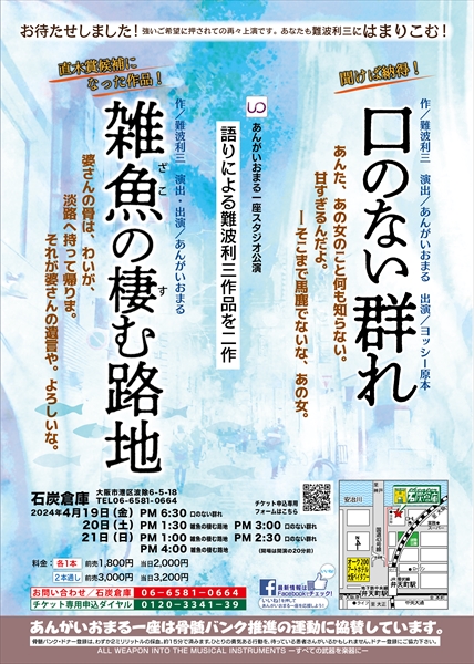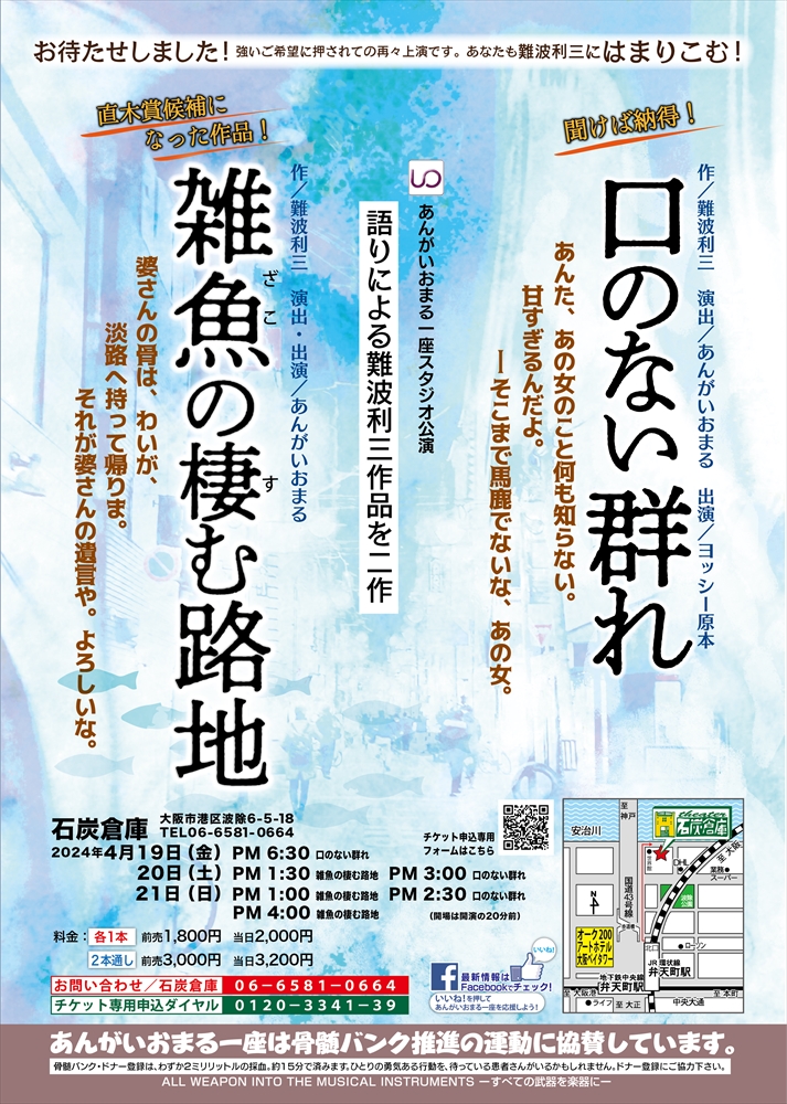 あんがいおまる一座スタジオ公演 語りによる難波利三作品を二作。 強いご希望に押されての再々上演です。 あなたも難波利三にはまりこむ! 『口のない群れ』 『雑魚の棲む路地』 ![]() 拡大する